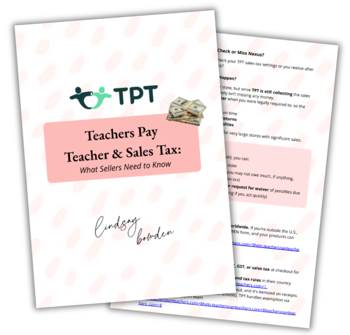 This free guide covers what sales tax actually means for TPT sellers, when TPT collects it for you, and what to do if you think you’ve missed something (no shame!)
